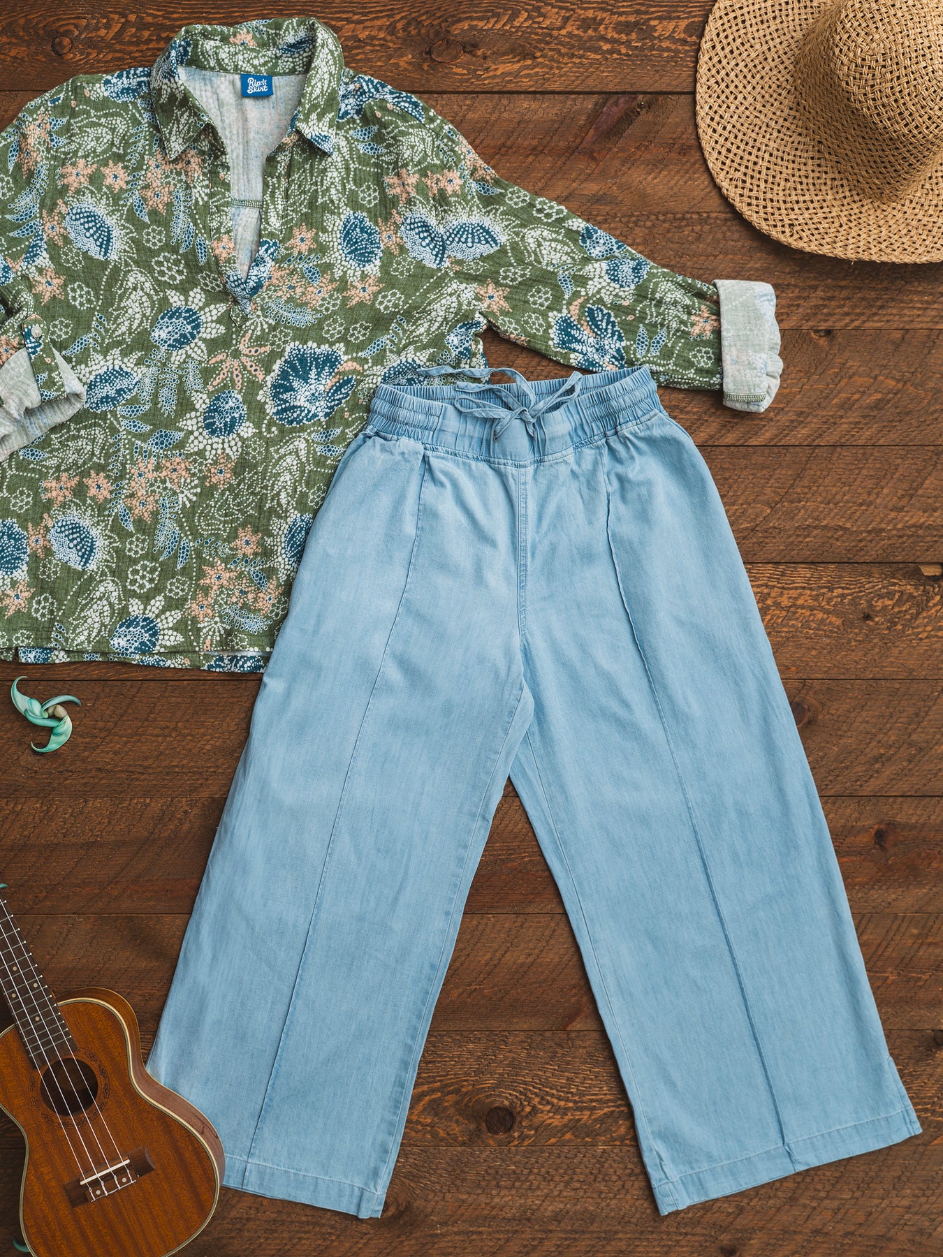 Introducing our Coastal Crop Pant - with a cropped length for a breezy, effortless look. Classy pin-tuck front seams, wide leg, an elastic waistband with drawstring tie allows for a more adjustable fit, and functional side pockets. We recommend ordering your usual pant size. Want more sizing information? Check out our model sizing page!