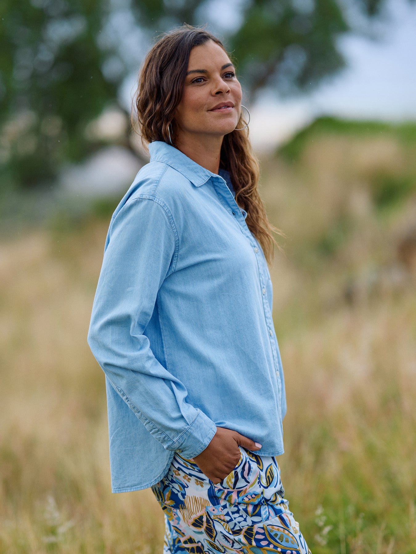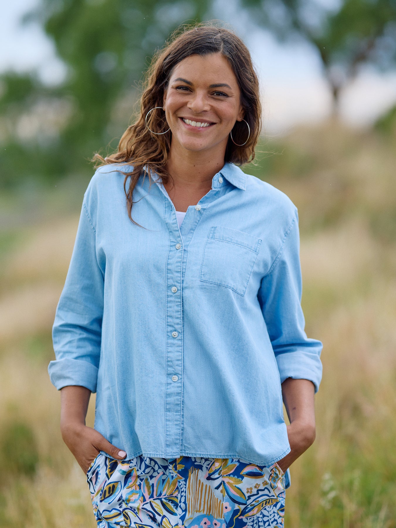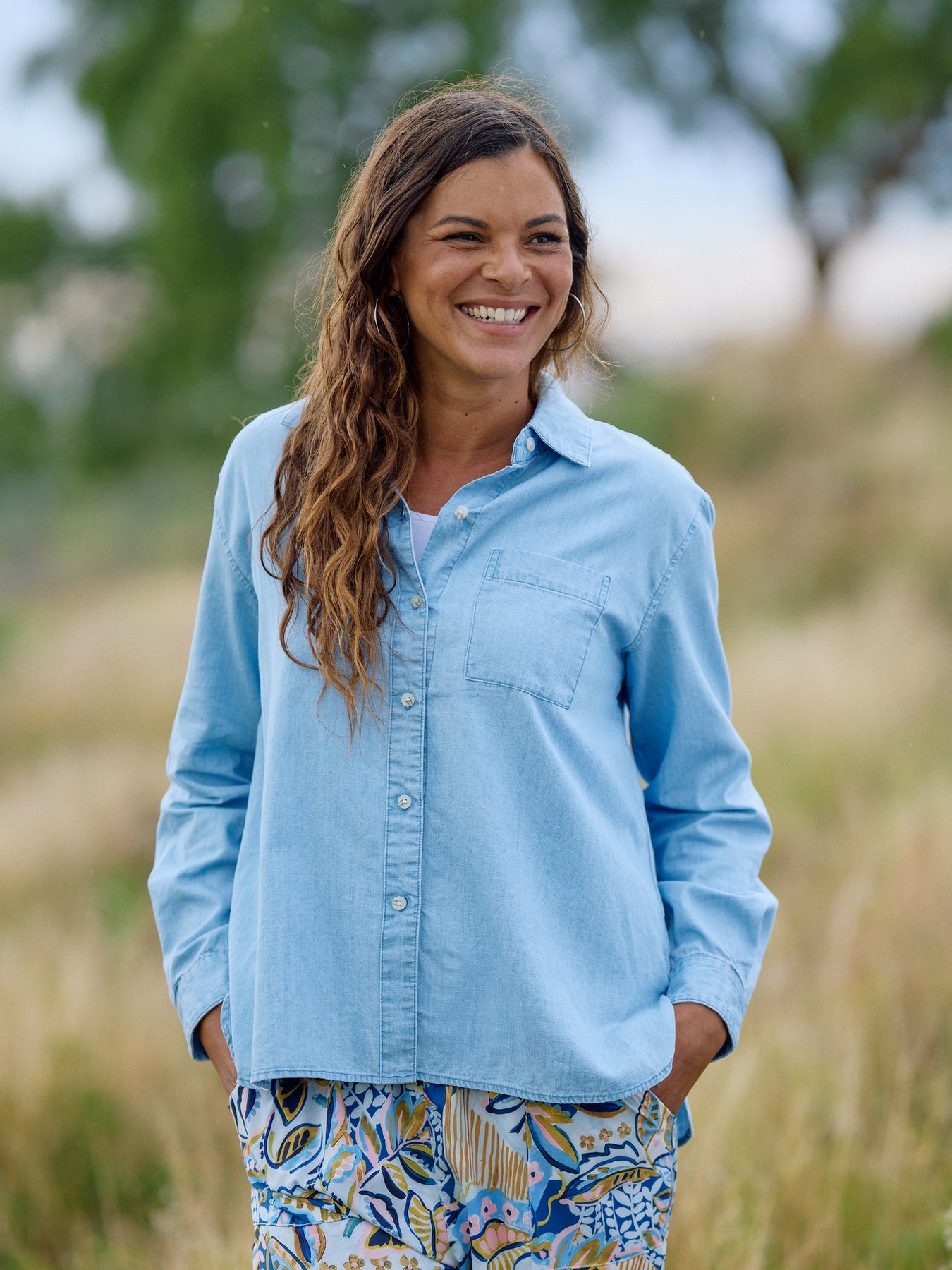 This relaxed-fit chambray button-up shirt features a curved hem and effortless drape, flattering whether worn buttoned as a classic shirt or left open as a light layer. If you prefer a closer to body fit we recommend sizing down. Want more sizing information? Check out our model sizing page!