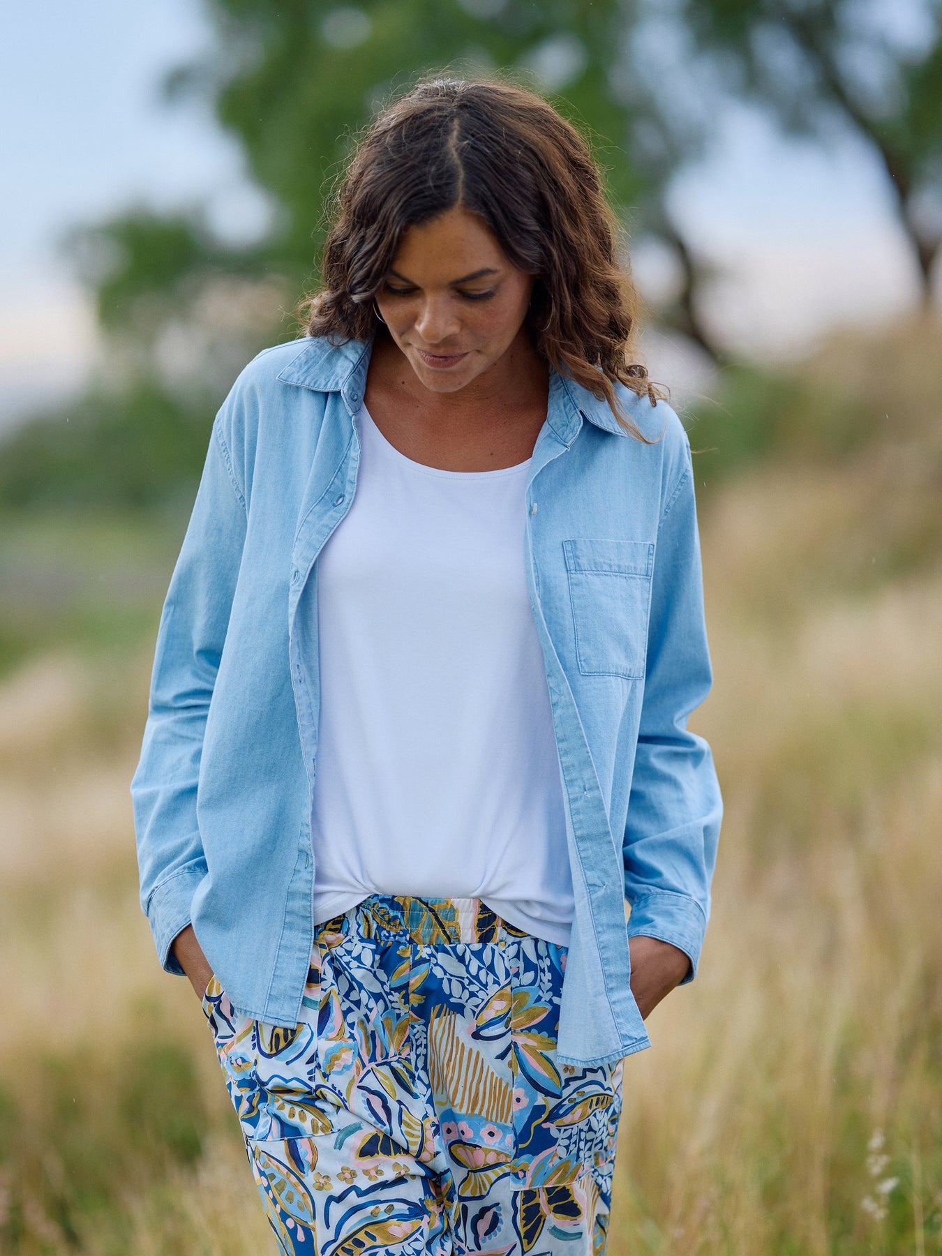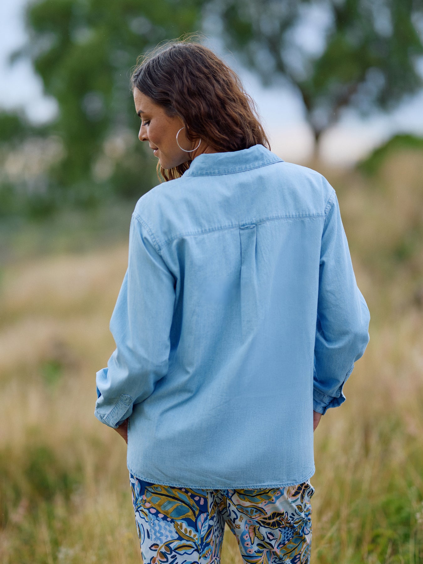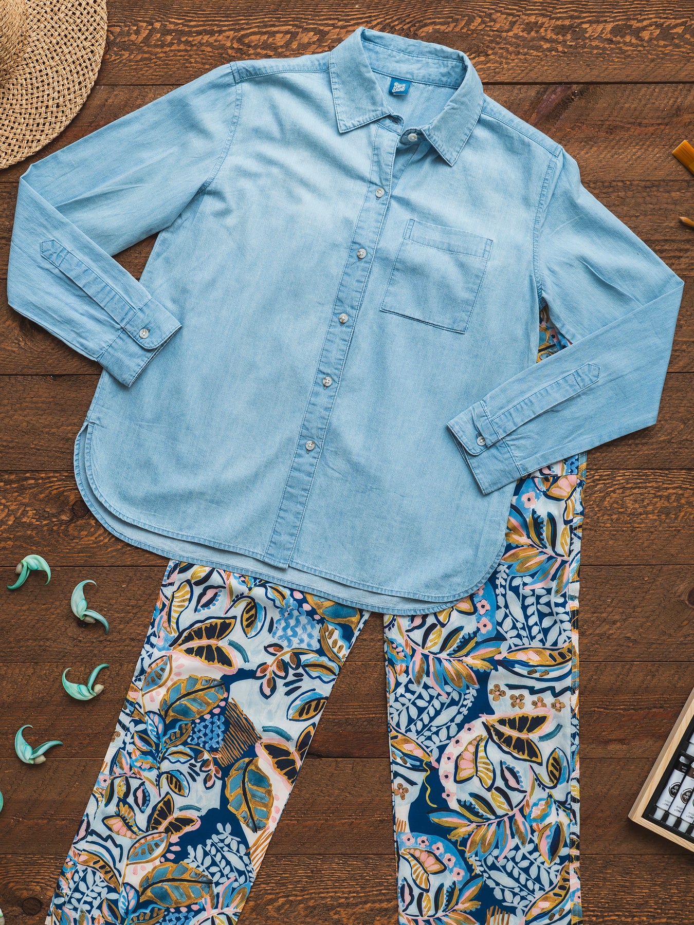 This relaxed-fit chambray button-up shirt features a curved hem and effortless drape, flattering whether worn buttoned as a classic shirt or left open as a light layer. If you prefer a closer to body fit we recommend sizing down. Want more sizing information? Check out our model sizing page!