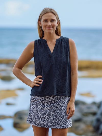 The Holoholo Dress creates flowing, flirty lines with its loose fit. Leave it loose or use the tie to belt for a more figure fitting shape. We recommend ordering your typical size. Want more sizing information? Check out our model sizing page!