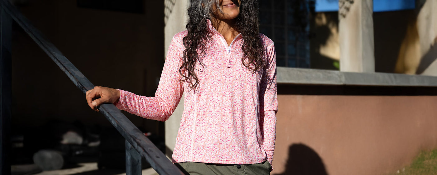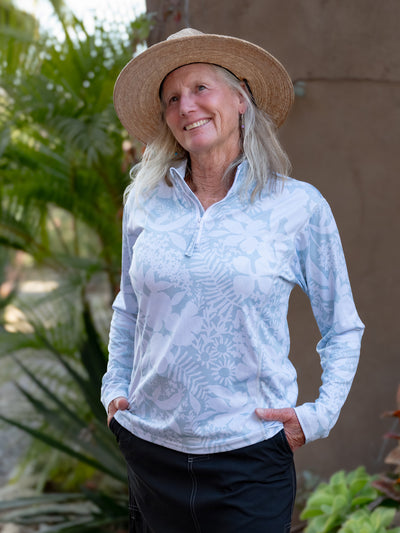 The Half Zip is a relaxed fit so that you can wear it as a cover-up for breezy sun protection. The zip neckline allows for adjustable airflow and the stretch knit fabric (same as our Runaround Dress!) provides UPF 50 protection for all day wear. If you are large-chested or prefer a looser fit, we recommend sizing up. Want more sizing information? Check out our model sizing page!