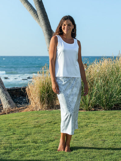 You'll love this neutral grey and white subtle boho style floral. A hint of black speckle in the background creates a great look when paired with a black top
