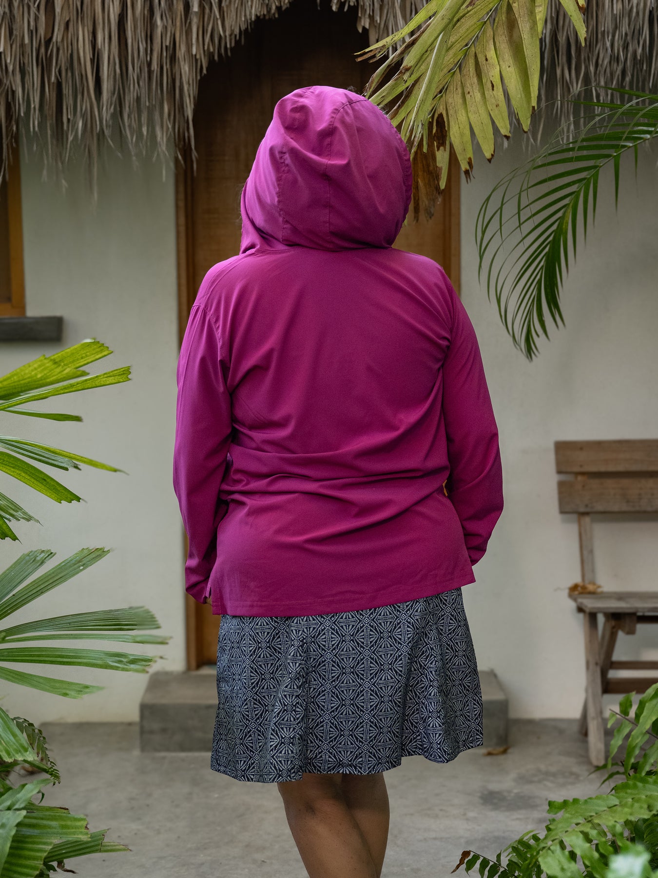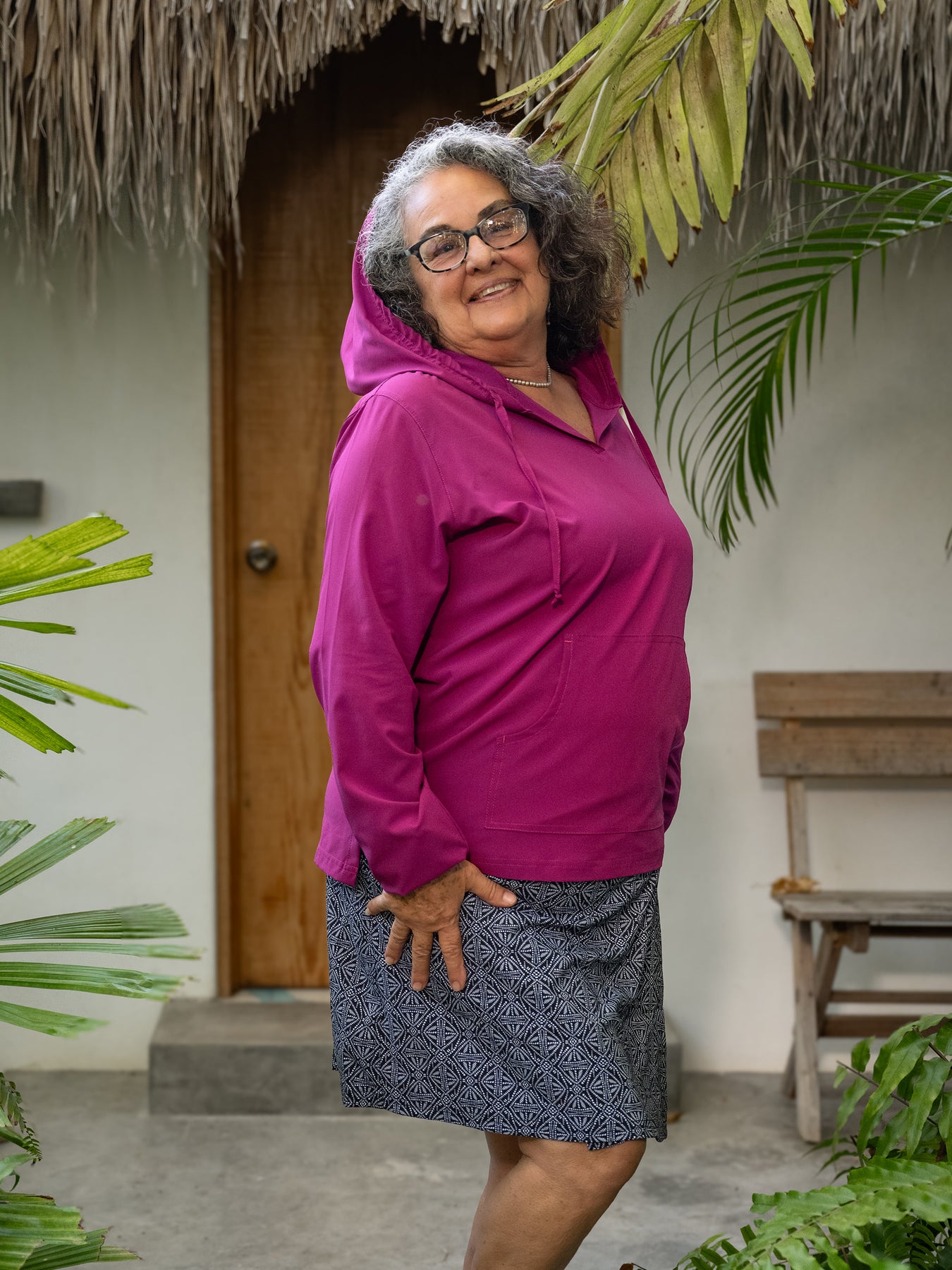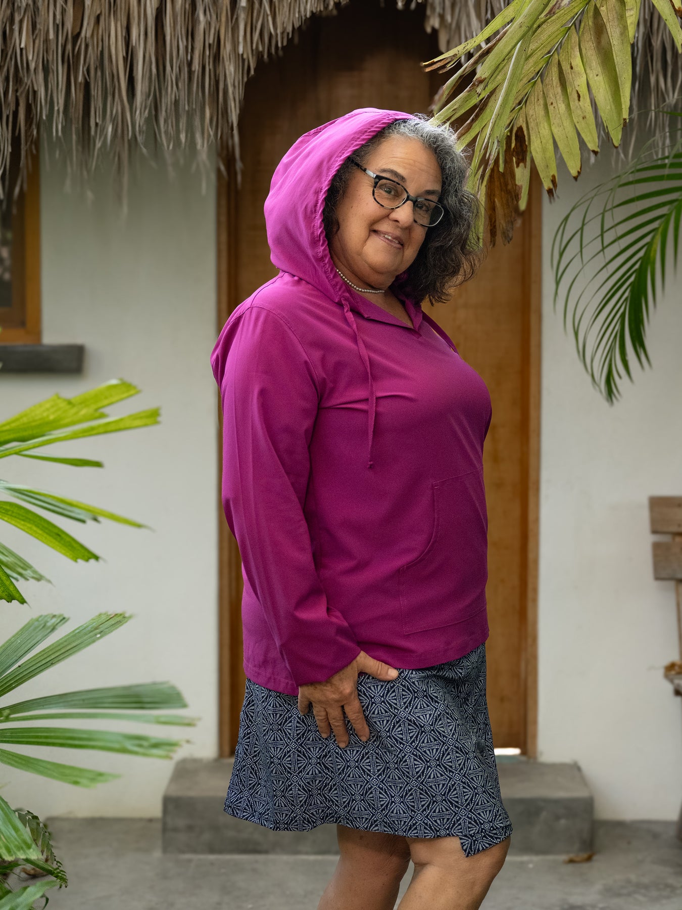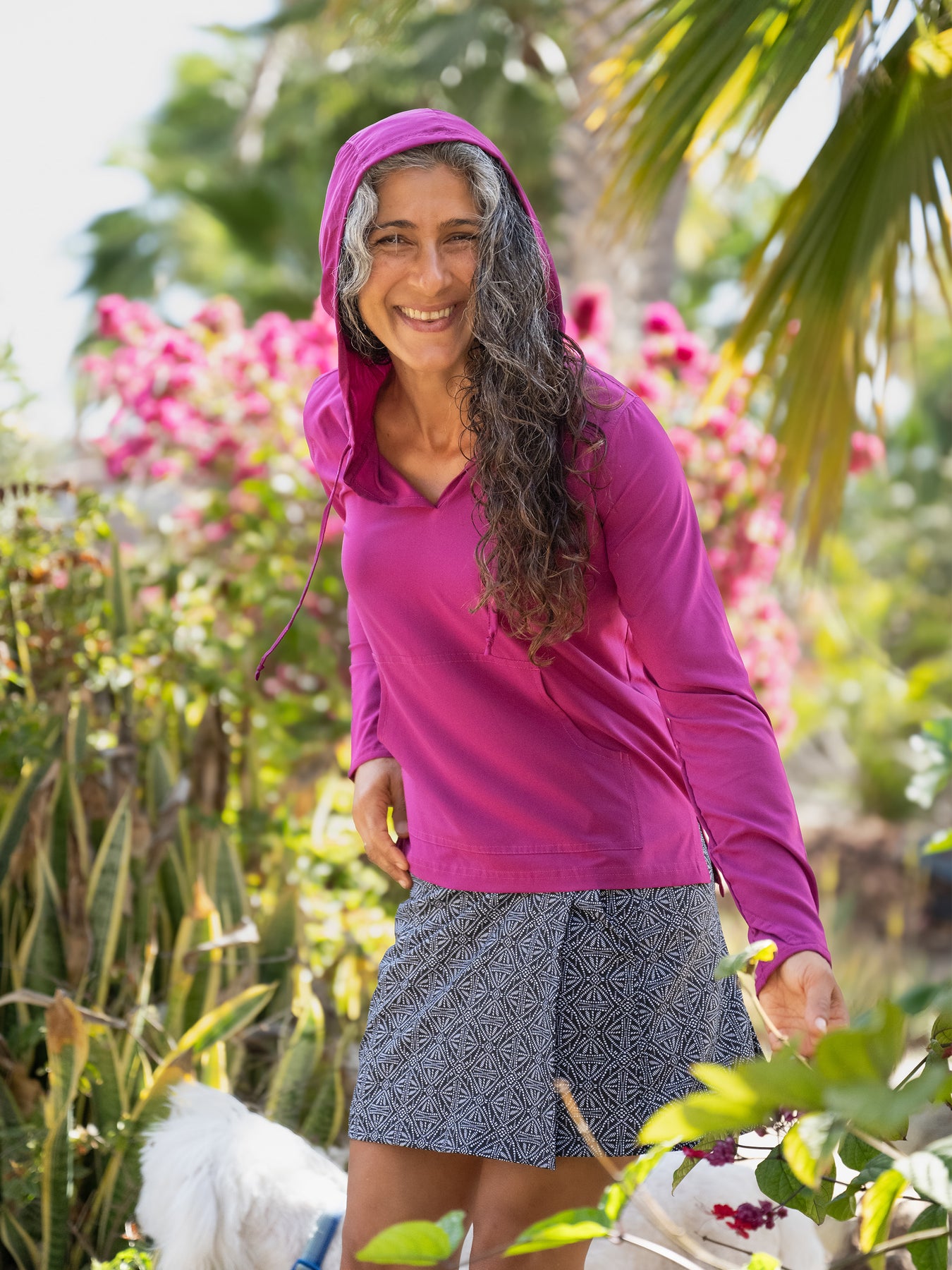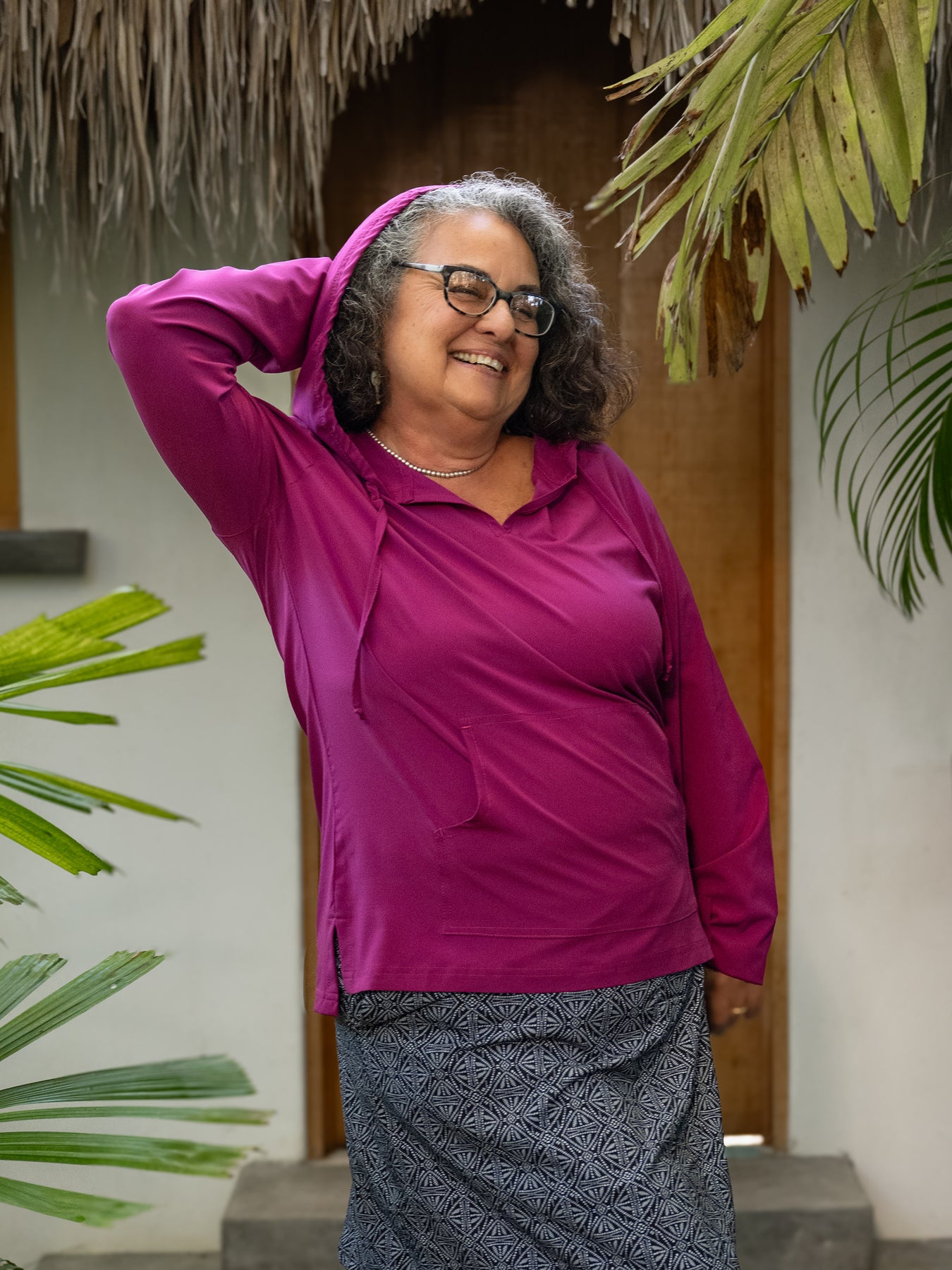 The Sun Hoody is a loose, comfy fit so that you can wear it as a cover-up for breezy sun protection. It has slightly longer arms with thumbholes to provide sun coverage for your hands. If you are large-chested or prefer a looser fit, we recommend sizing up. Want more sizing information? Check out our model sizing page!