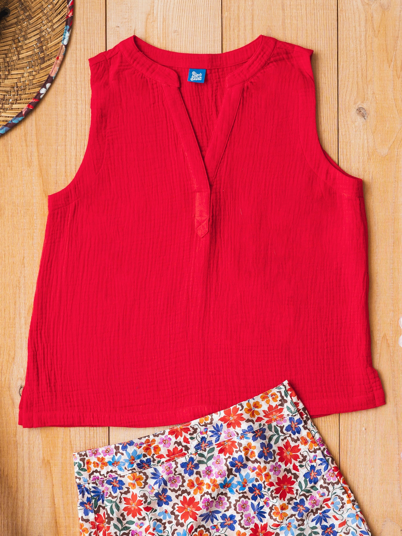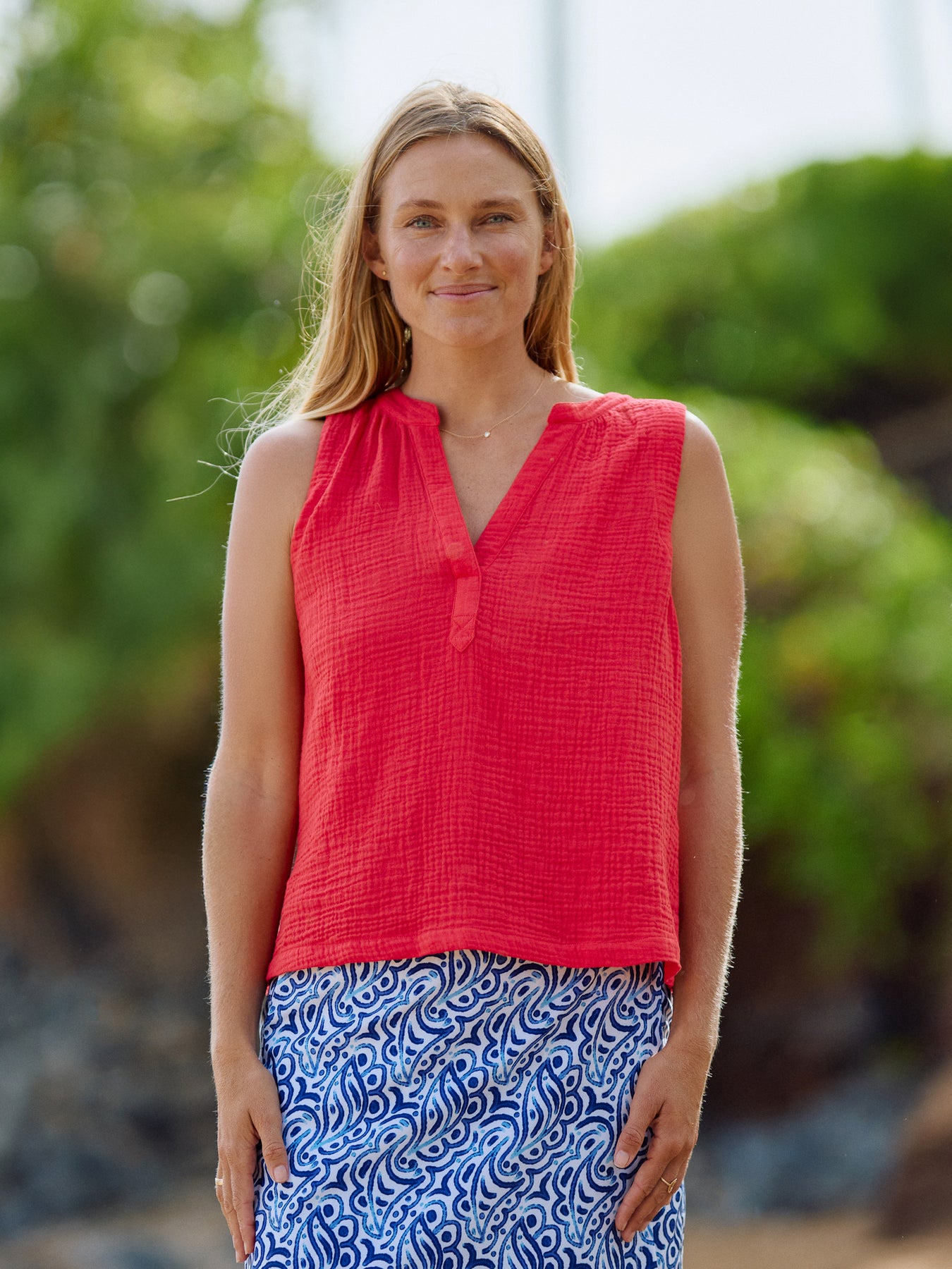 The Popover Tank was designed to be relaxed and comfortable with a slightly boxy fit that is breezy, cool, and flattering. If you prefer a closer to body fit we recommend sizing down. You can also check out our model sizing page for more sizing guidance!